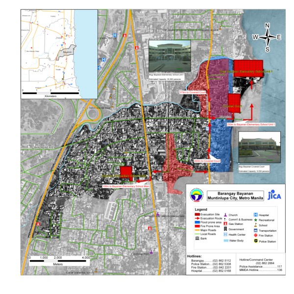 The project aims to produce community level evacuation maps for vulnerable barangays in Metro Manila facing multiple hazards such flood, earthquake and fire. Aside from the preparation of GIS-based Barangay Disaster Evacuation Area Maps, SRDP participated in public awareness activities and consultation on Disaster Evacuation Areas. Barangay-wide GIS data were also updated through selective ground and structure surveys using Global Positioning System (GPS) equipment and other mapping tools. Sample Outputs: |